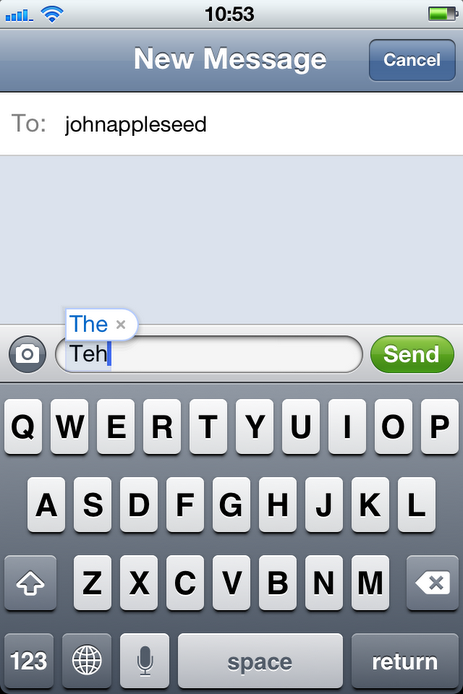 In this first example, auto-correction was enabled. I misspelled the word “the”. A pop-up indicates that I misspelled a word. The word located inside the pop-up is the word auto-correction will use to replace my misspelled word. If I disagree with auto-correction’s word choice, I can tap the “x” in the pop-up and the word will stay as I originally spelled it. However, if I simply hit the space button, auto-correction will automatically insert the “corrected” word into the message.