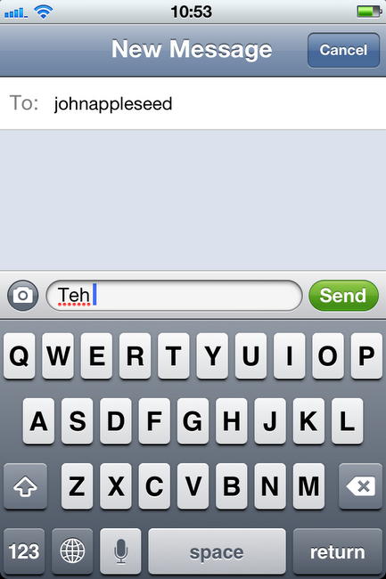 In this second example auto-correction was disabled. I misspelled the word “the” again. No pop-up appears to tell me I misspelled a word. However, once I hit the space button, the misspelled word has a red dotted underline. If I want to leave the word the way I spelled it, I simply continue typing my message.