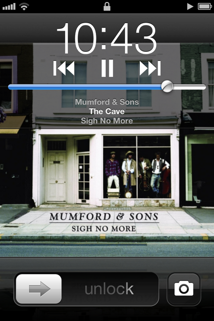 After double-pressing the home button, you will see music controls appear below the digital clock. These music controls will let you play a song, pause the song, skip a track forward, or skip a track backwards. In the picture below, you can see what it looks like if you tap the play button. Cover art for the song that is playing will appear, along with the artist, album, and song title.