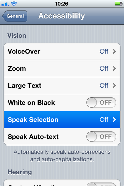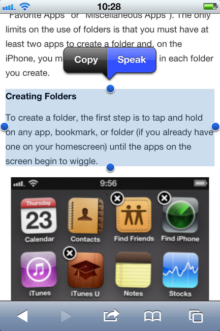 With Speak Selection enabled, you can have your iPhone read to you any text that you highlight. This can come in handy when, for instance, you are driving and receive a long email that you want to read.