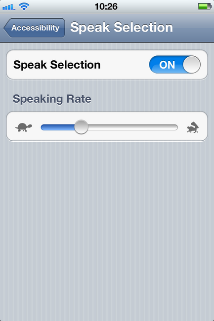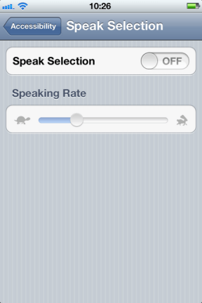 Speak selection is now turned on. Underneath the toggle you will see a sliding bar that allows you to adjust the speaking rate. The closer you move the slider to the rabbit on the right, the faster the speaking rate will be. Once you release the slider after moving it, you will hear a short sentence that lets you hear how fast you have set the the speaking to be.
