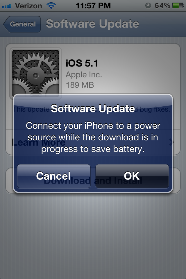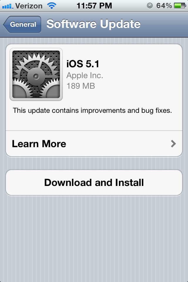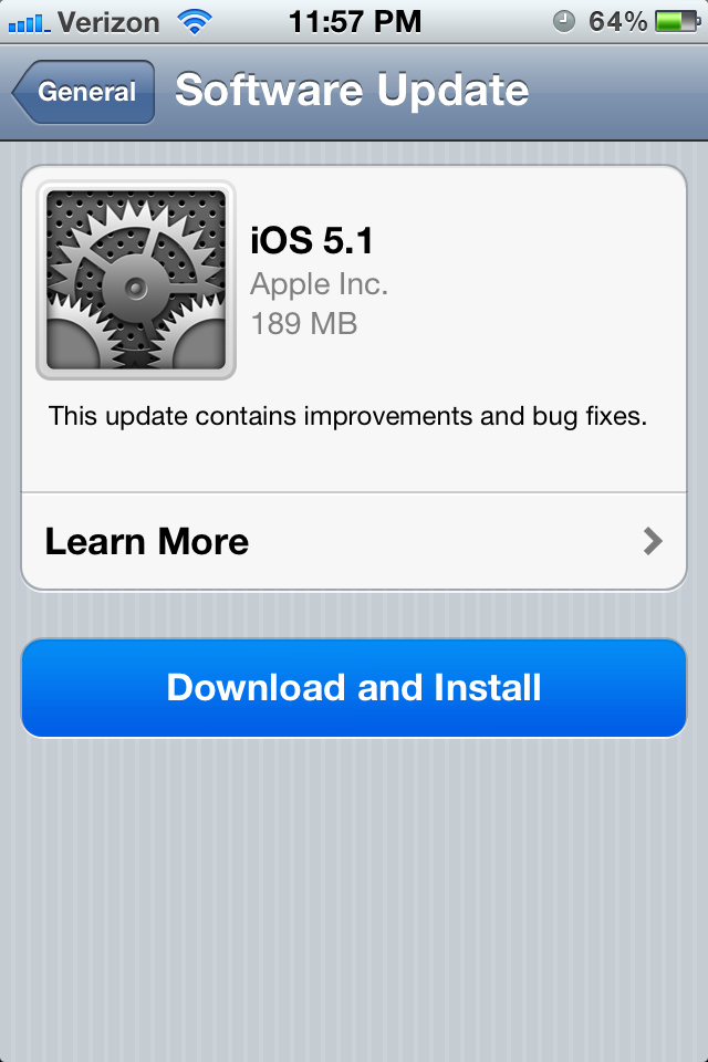 You should now be at the following screen. As you can see, an update is available. By tapping “Download and Install,” you are able to update your iPhone to the latest version of the software (iOS 5.1 in this case)–without having to connect your iPhone to the computer.