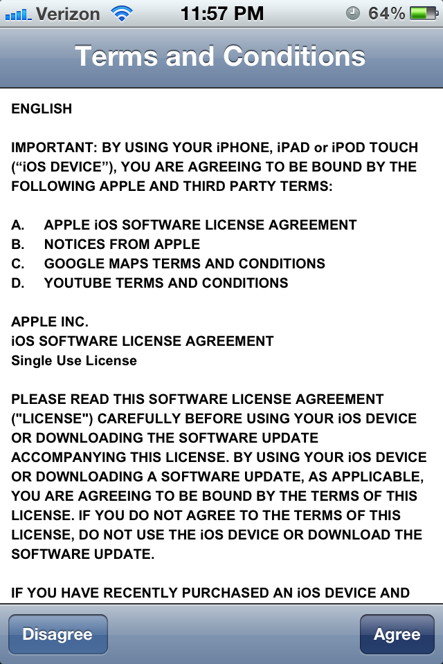 You will presented with the Terms and Conditions for using the update (the iOS 5.1 software). You can find the “Agree” button on the bottom right of the screen.