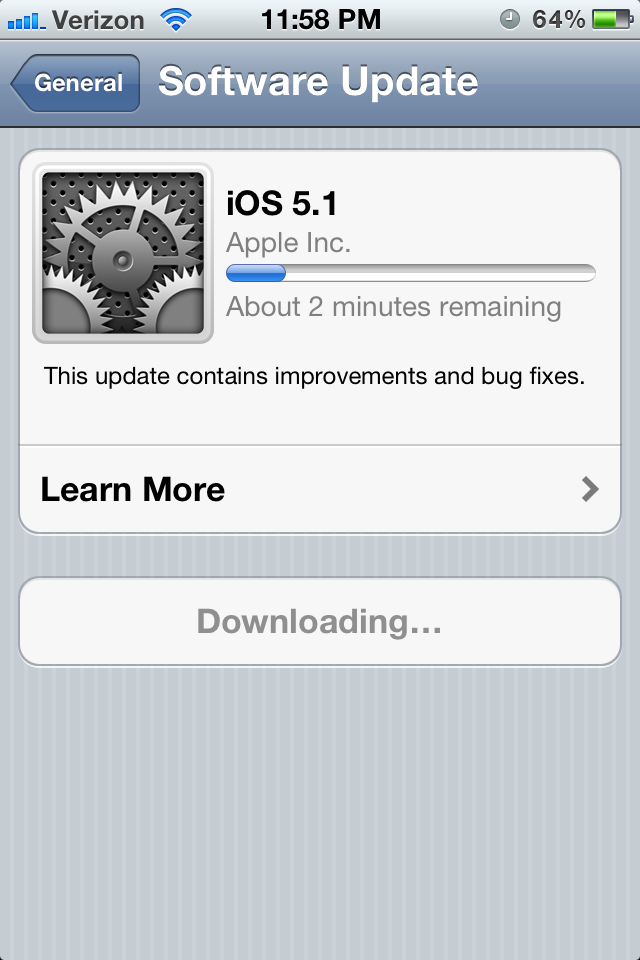 The update will begin to download. This process can take awhile. (Although the picture says “2 minutes remaining”, it really took between 5-10 minutes.)