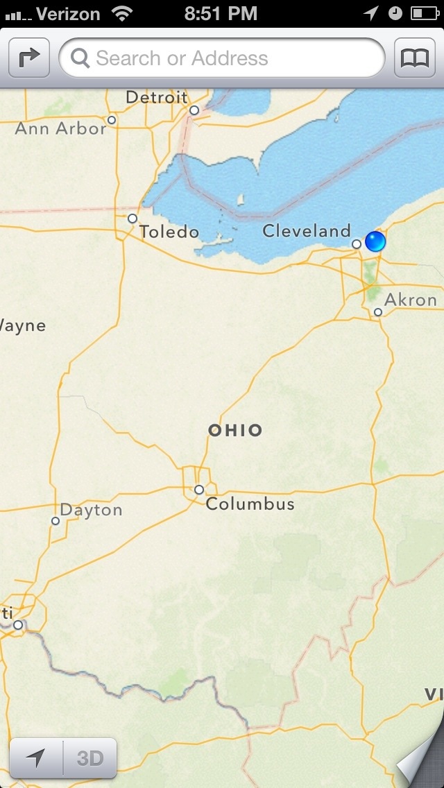 You’ll see something like this screenshot below. Here is where you can instantly figure out where you are simply by touching the little arrow button located in the bottom-left of the screen. This will pinpoint your current location.