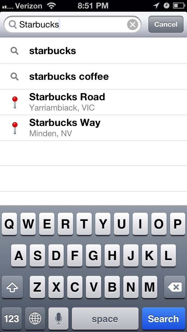 In this example, it is Starbucks! You’ll see some suggestions pop up while typing. If you see what you’re looking for in one of the suggestions, go ahead and touch it. If not, finish out your typing and hit Search.
