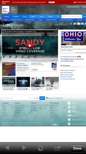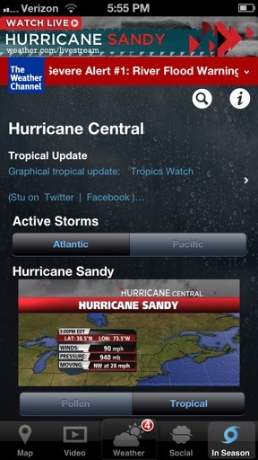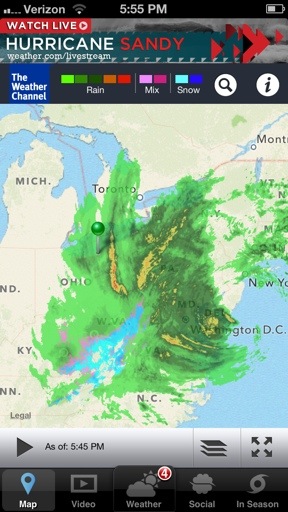 As I was typing this post, Hurricane Sandy was about to make landfall on the East coast. This app currently has a banner located at the top of the screen displaying a link to watch live coverage of the hurricane courtesy of The Weather Channel’s YouTube channel.