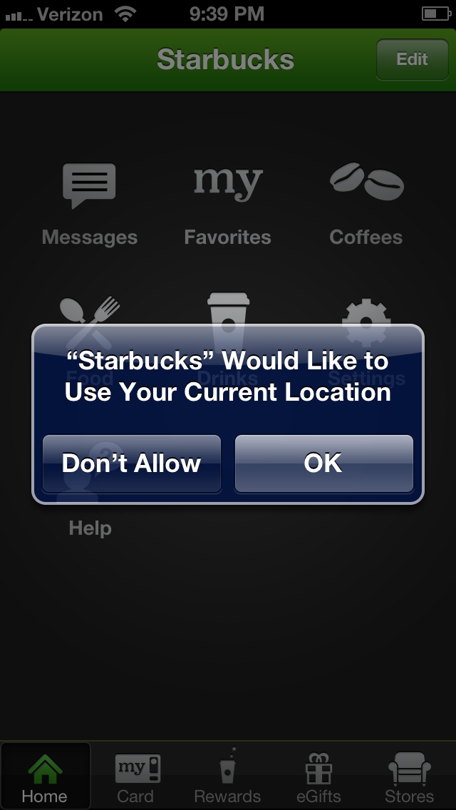 It will ask you to use your location because a feature within the app find Starbucks locations around you. If this sounds helpful to you, hit OK.