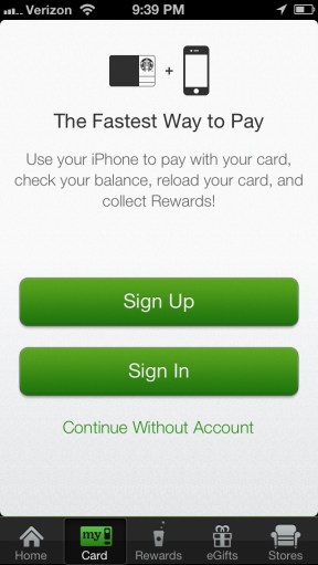 If you continue without an account, you'll go straight to a screen prompting for your Starbucks gift card information.