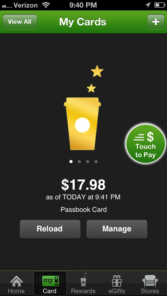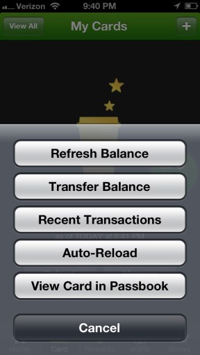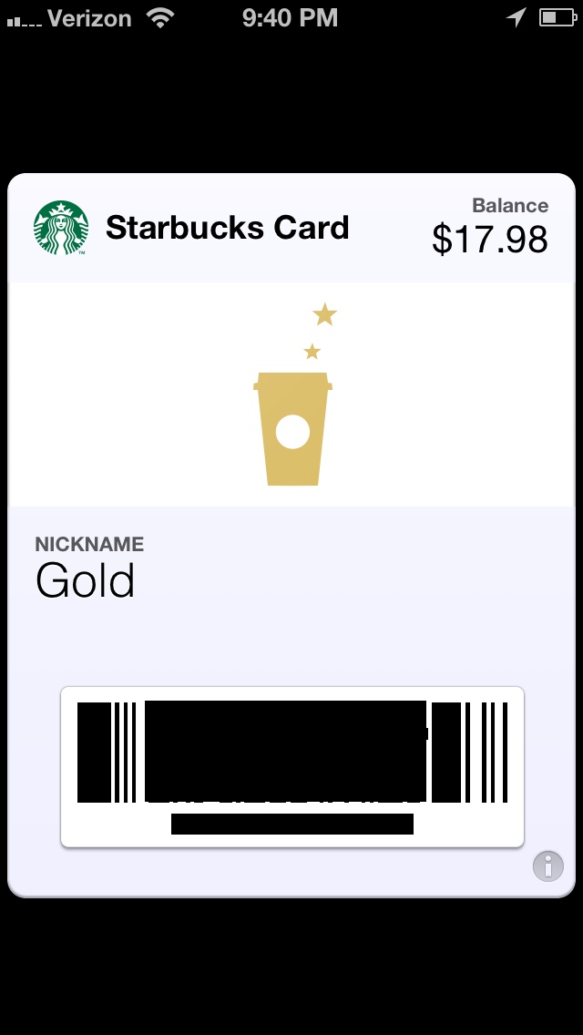 This is your digital representation of your actual physical Starbucks gift card. When you are in line at Starbucks, opening up your Passbook app and allowing the cashier to scan this will be sufficient to pay for your drink. How cool is that?