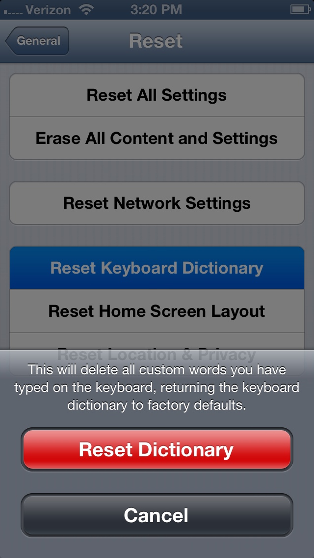 Here, find Reset Keyboard Dictionary. This will revert your iPhone’s bank of words it uses to correct your so-called “typos” back to when you first got your iPhone.