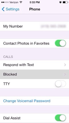 Here you’ll see settings concerning the actual phone of your iPhone. You’ll also see your phone number (I blurred out mine for obvious reasons).