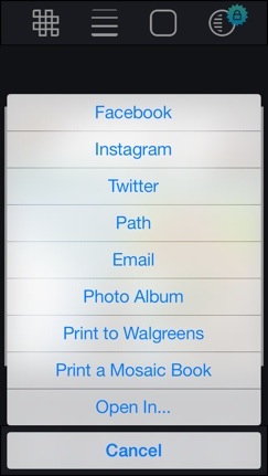 Look at all those options. To just save to your iPhone, select Photo Album. But as you can see, you can upload straight to Facebook, Instagram, and Twitter, or even order prints of this new photo at Walgreens for in-store pickup.