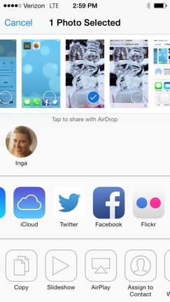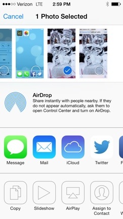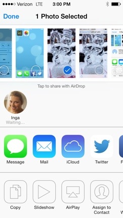 20140104-150300.jpgHere, you’ll see all the options that you can do with this photo. What we want to do is use AirDrop! See the area in the middle of your screen that says AirDrop? Be patient. Once your device finds someone around you that has AirDrop enabled, they will appear in that area. If they never appear, make sure they have it enabled in their Control Center. Once it’s ready, it’ll look something like this: